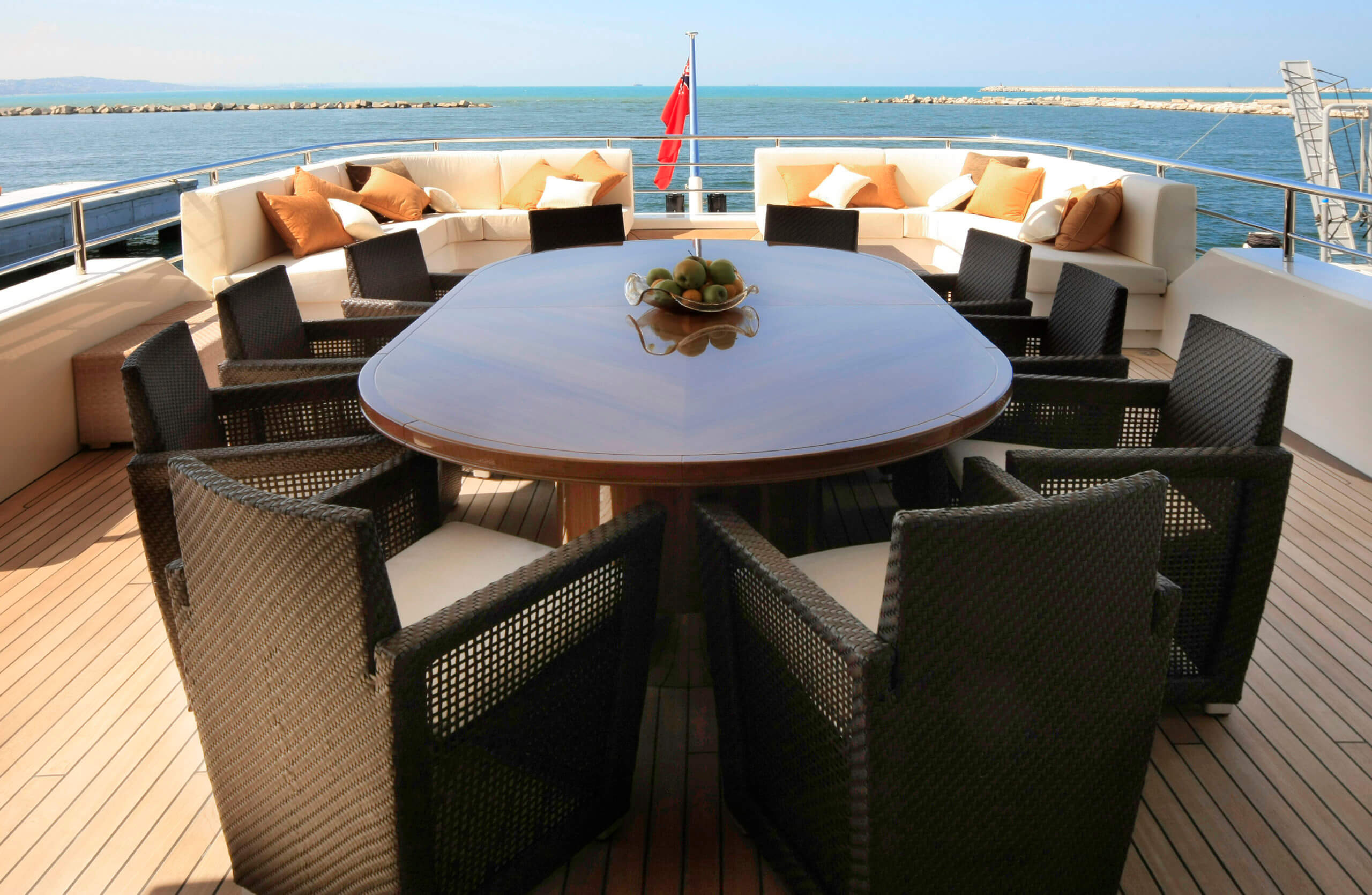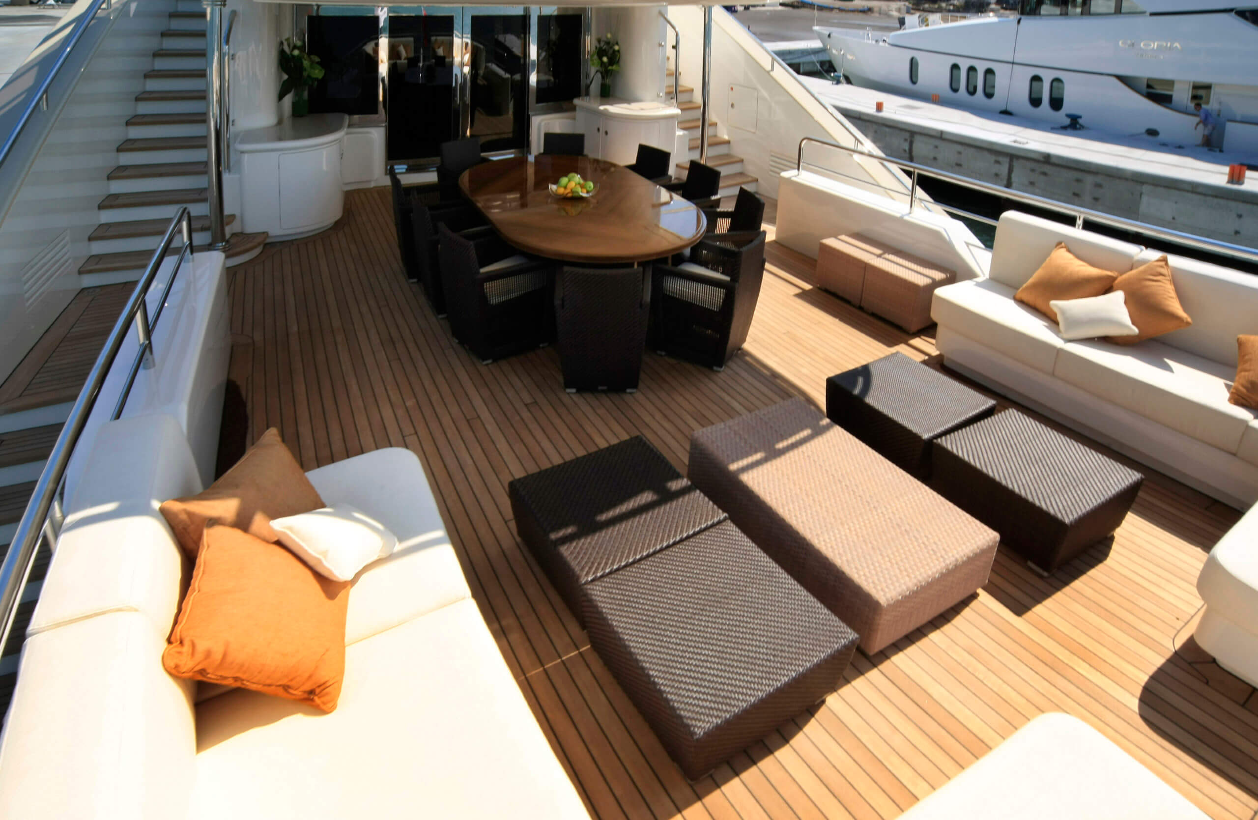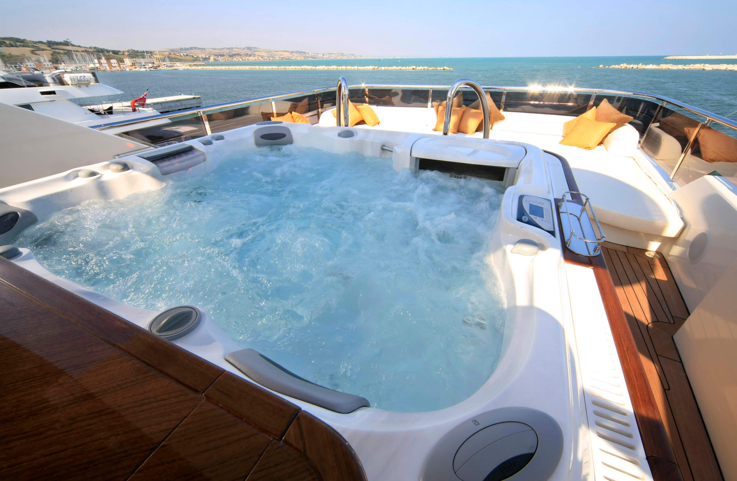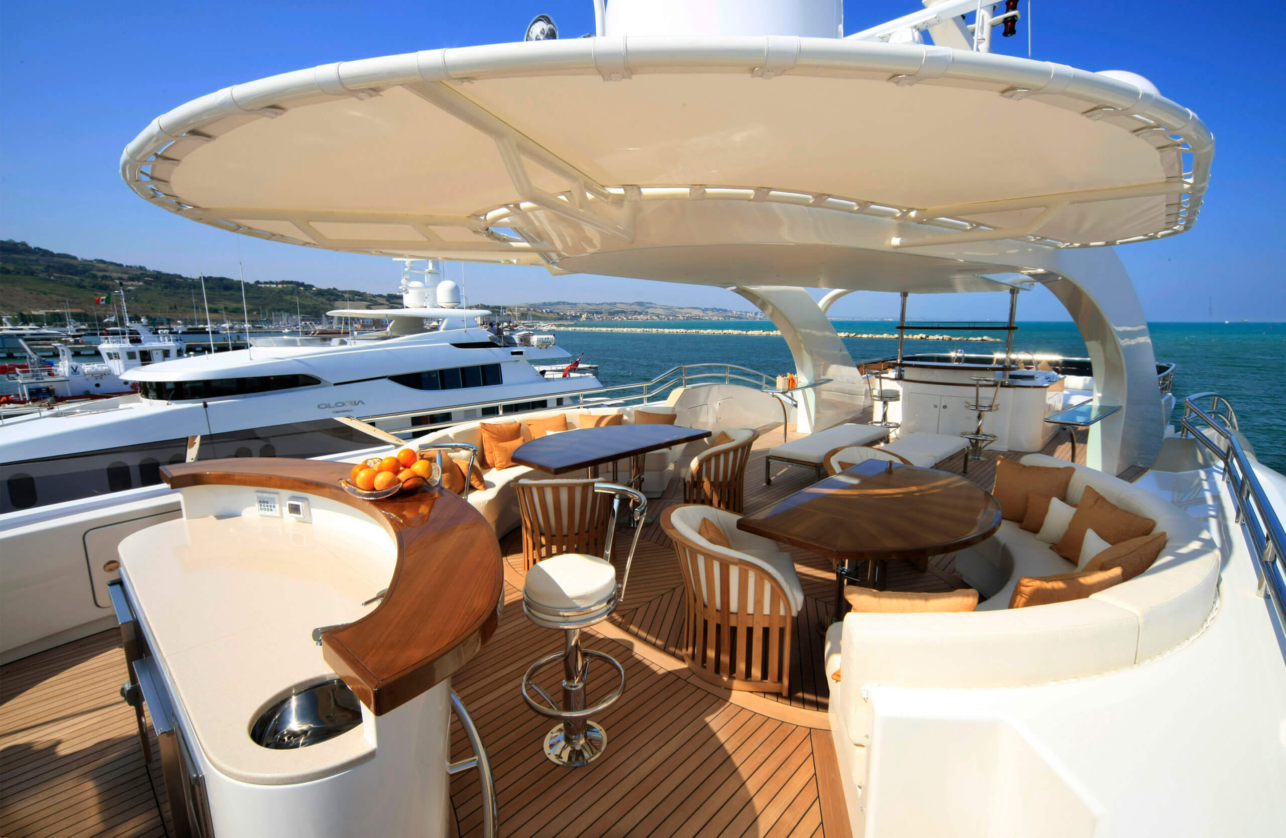 Its visual architecture is truly distinctive: two side staircases rising from the aft platform to the sun deck, and a sculptural roll bar that draws the eye, creating a strong scenic presence.